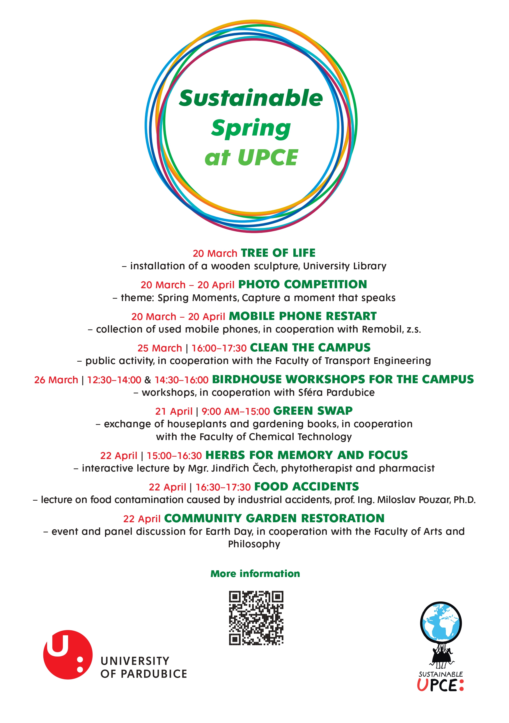 Udržitelné jaro na UPCE je sérií aktivit, které dávají prostor kreativitě, spolupráci i konkrétním činům v oblasti odpovědného přístupu k životnímu prostředí. Udržitelnost zde není jen téma, ale zkušenost. Je to společná cesta, jak rozvíjet univerzitní prostředí tak, aby bylo inspirativní, ohleduplné a živé.