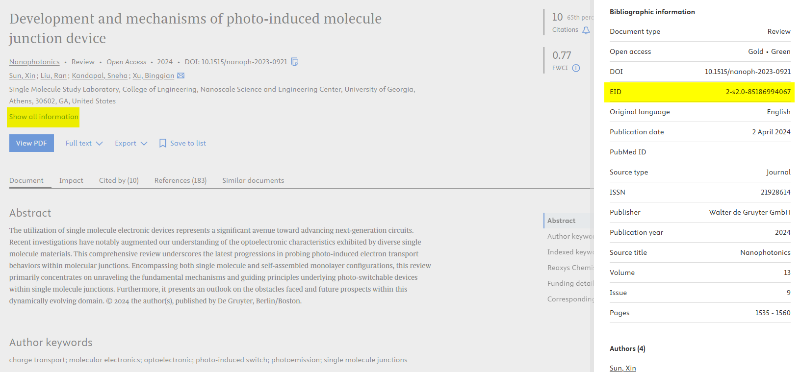 EID (Scopus ID) je identifikátor záznamu výsledku registrovaného v databázi Scopus. Scopus EID v detailu příslušného záznamu po rozkliknutí tlačítka „Show all information“.