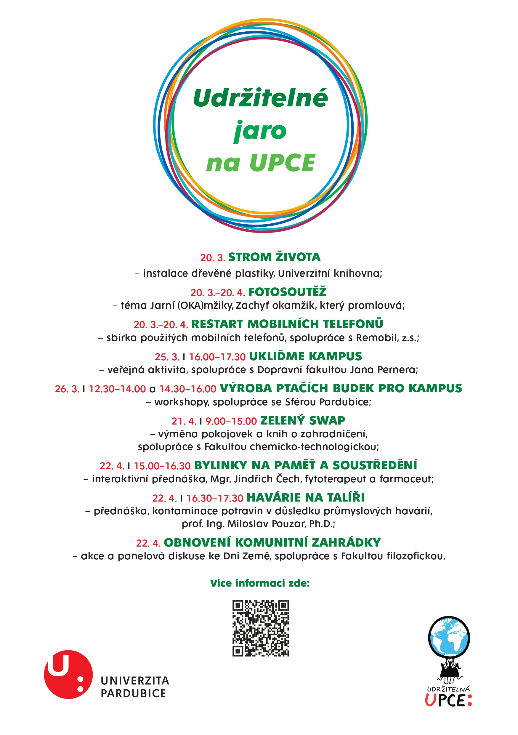 Program Udržitelného jara na UPCE vyvrcholí akcemi spojenými s Dnem Země. Už 21. dubna se zájemci z univerzity nebo veřejnosti mohou zapojit do akce Zelený swap – výměna pokojových rostlin a knih o zahradničení, který proběhne ve spolupráci s Fakultou chemicko-technologickou od 9 do 15 hodin. Univerzita pak 22. dubna zve také na přednášku prof. Ing. Miloslava Pouzara, Ph.D. z Fakulty chemicko-technologické Havárie na talíři (16.30–17.30), která se bude věnovat problematice kontaminace potravin po průmyslových haváriích. Studující a zaměstnaní Fakulty filozofické organizují 22. dubna pro veřejnost panelovou diskusi a společnou akci Obnovení komunitní zahrádky v kampusu. Program 22. dubna zahrnuje také interaktivní přednášku fytoterapeuta a farmaceuta Mgr. Jindřicha Čecha pod názvem Bylinky na paměť a soustředění (15.00–16.30), která je určena pouze pro zaměstnané a studující.